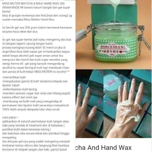 Cara pemakaian miss moter matcha & milk hand wax. Oleskan produk miss moter matcha . Miss moter matcha & milk hand wax terkenal di taiwan harum banget dan gel super kental dan kini bpom di indonesia. Beli produk perawatan tubuh hanya di blibli. Hanya dgn 1 kali pemakaian anda akan lihat .